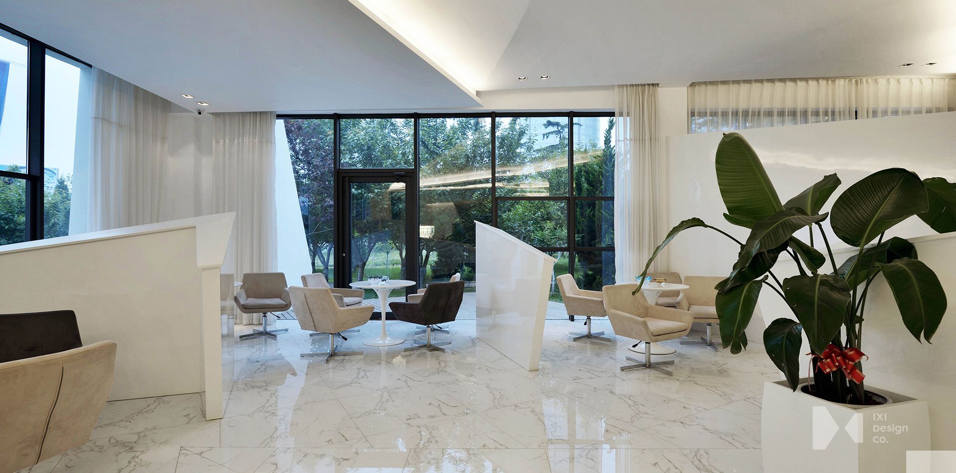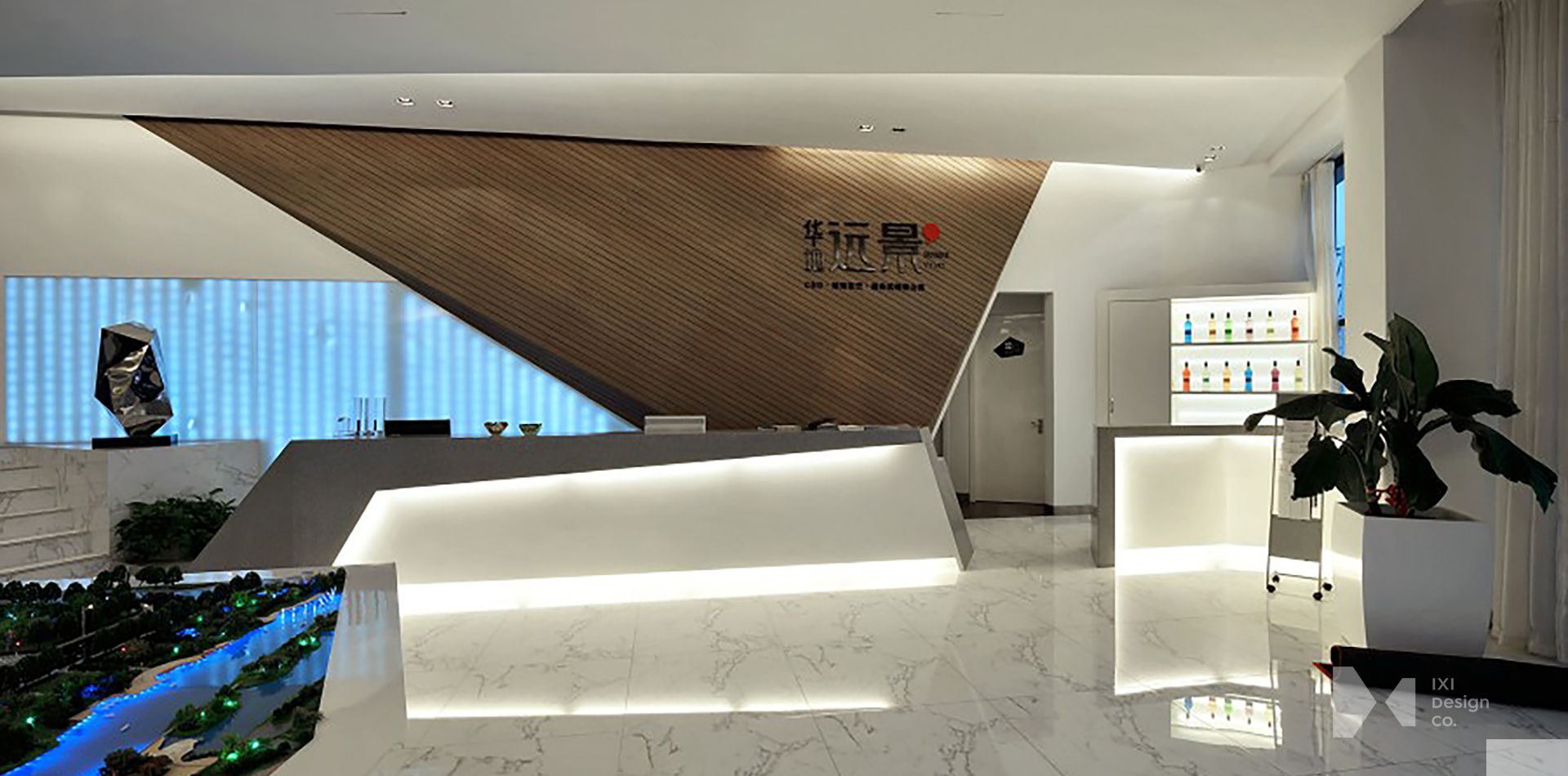 模型區底座與整體天花板皆為同樣概念,透過適當的折線比例,形成空間的起伏感受,大面積折板天花更體現浪潮的波浪,洽談區的Partition是我們想呈現的一種嘗試,透過三角形與鑽石雕刻方式去包覆洽談空間,讓人感覺到一種開放性的隱私,更專註在洽談產品上。