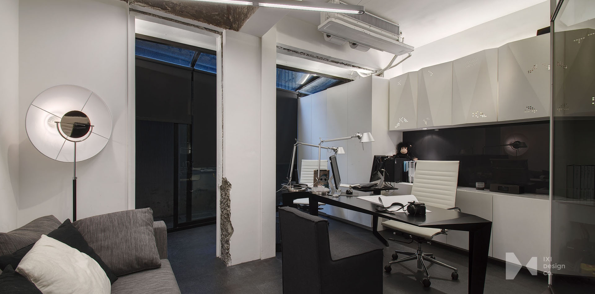 中間區域是設計師討論的基礎,桌面使用了剩余的木板,這些木板只經過木油處理,保留了許多結和蟲洞。在工業革命期間,這個地區的黑鐵椅是我們發現許多地方的地方。機械和粗糙的感覺,設計部門和討論區相互重疊。設計表由兩塊懸掛的12mm增強透明玻璃組成。X形支撐鐵件,上掛櫃包圍內用櫃,箱門打孔。受電影《變形金剛》的啟發,公司的專屬代碼由同事和公司信件組成,右側的黑色玻璃書櫃方便高管直接看到會議區和室外。廁所裏有一個淋浴間,用帶單向鏡子的透明玻璃做隔間。從裏面可以清楚地看到外面的空間,同時也可以保護隱私。墻上的灰色鏡子闖入屏幕,可以用來播放電影和作品。不銹鋼臺面被切割成一個定製的人造石盆,盆高只有100毫米,裏面有一塊傾斜的板,讓水在有紋理的石頭表面慢慢滑動。後方是主管區域,也是創意生產中心。也是接待客戶的地方。後頂棚采用透明玻璃增加照明空間。櫃子後面有落地窗有一個蹦床,讓需要加班的同事有地方休息和吊掛。黑色玻璃隔間和折疊門的設計是為了保持空氣流通,采用了帶有掛筋的T形黑鐵作為結構。
