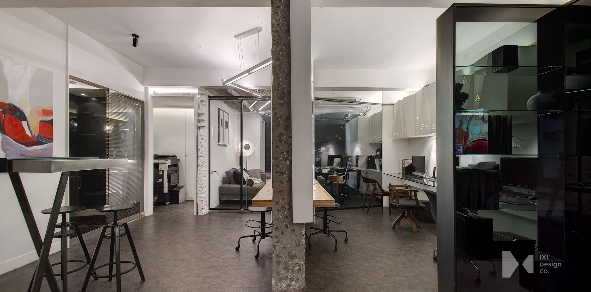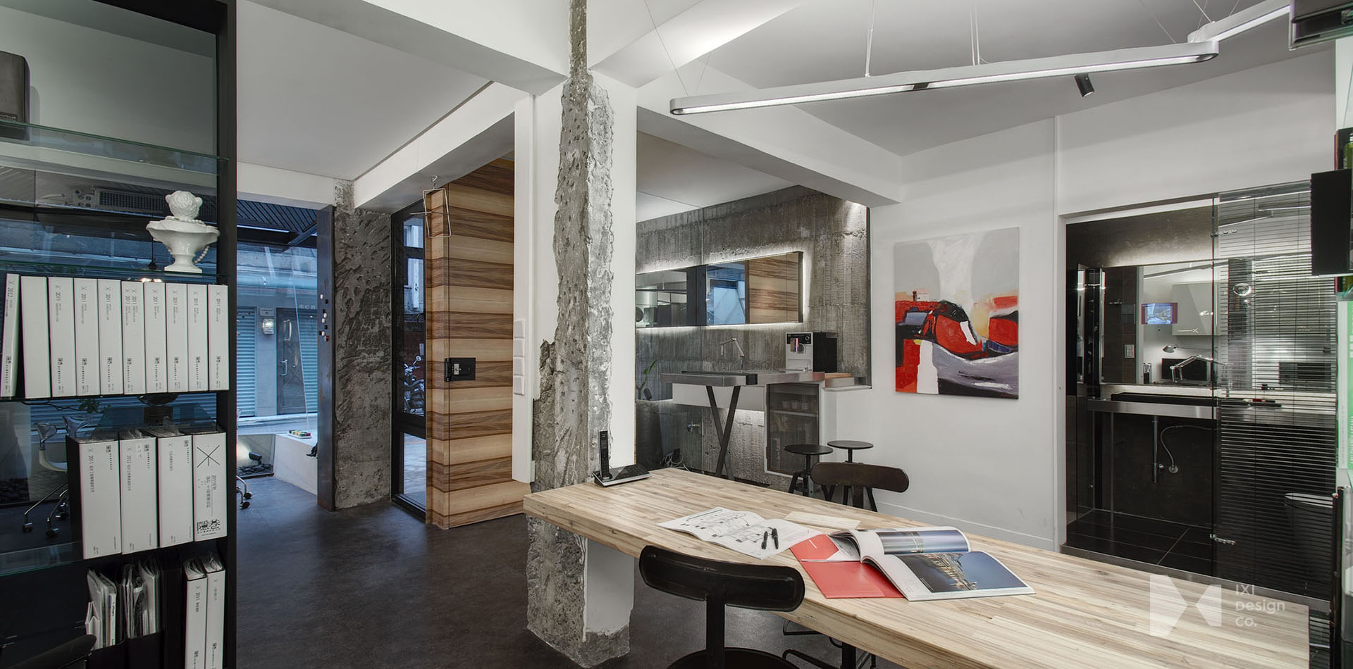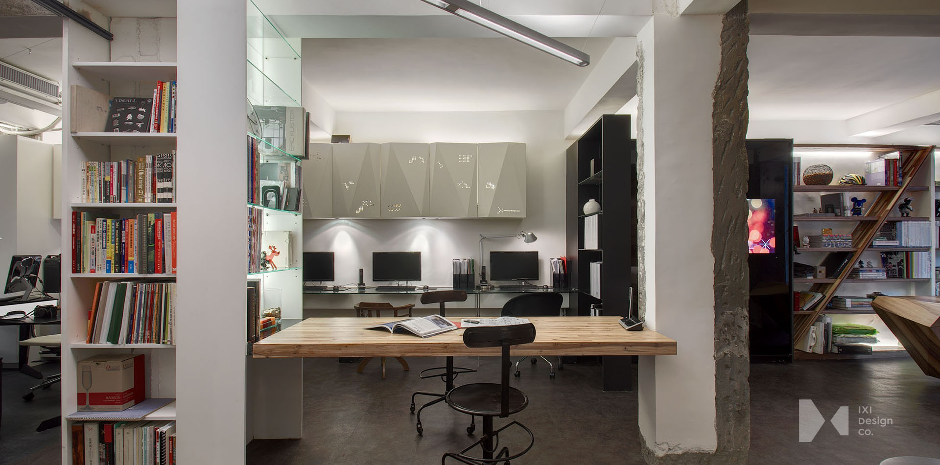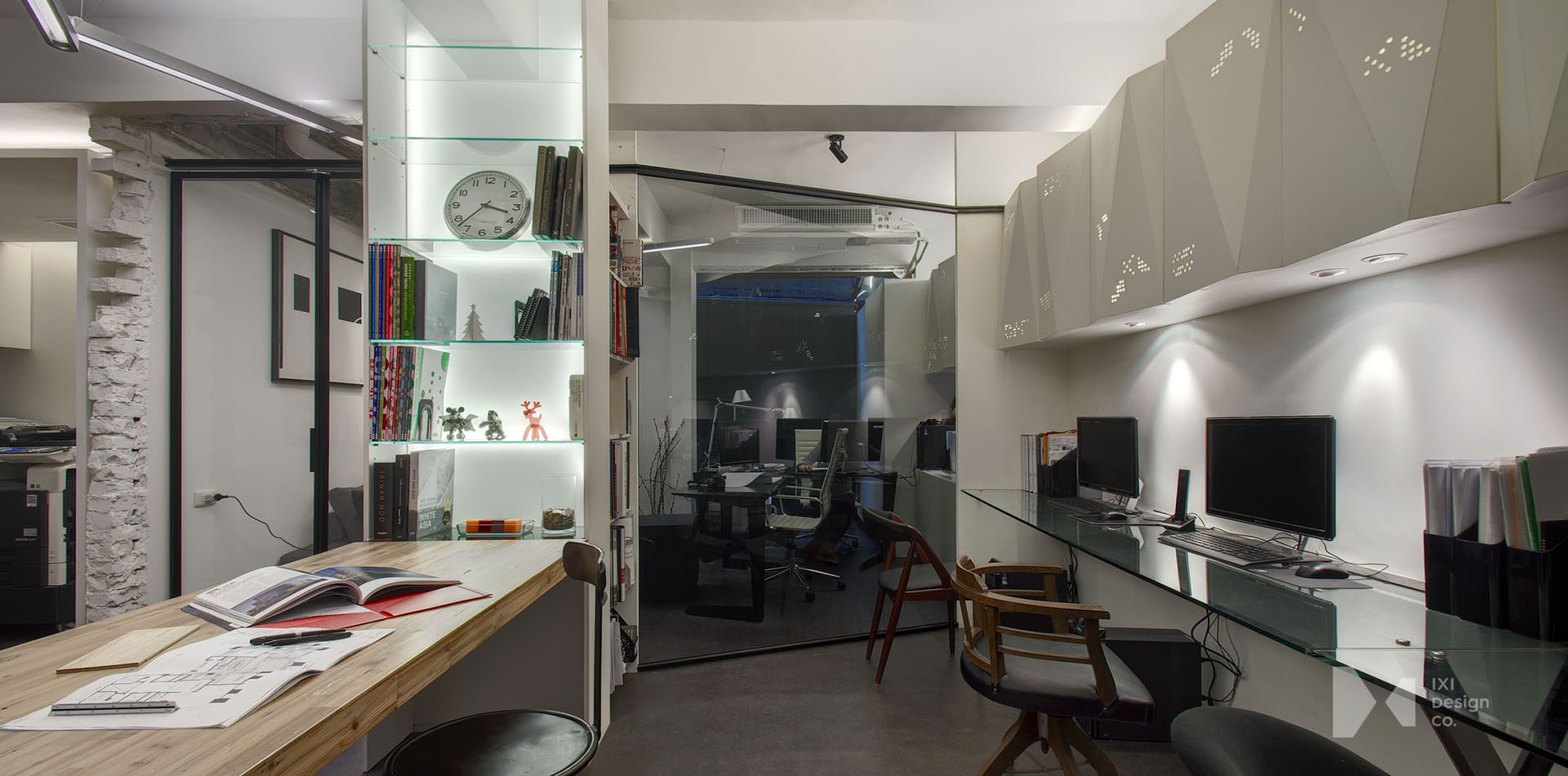 建築原有的結構柱上覆蓋著黑色的鐵板,使之慢慢滋養,適合老建築的年代。會議的室外墻壁是鋼化玻璃製成的。室內照明不足的問題也是節能的一個途徑。在裏面,我們保留著最初拆除和挖掘的痕跡。這是建築生命周期,與新材料產生沖突,但同時又相互匹配。按功能分區分為六個區,會議室和員工培訓區,迷你吧。需要互相重疊時,電視機就被打入料櫃門,這樣它就可以旋轉90度。根據需求,會議桌是由大幹木、玻璃和黑鐵組成,配上意大利單椅,這個區域也有塑料、鏡面不銹鋼、玻璃、木膠合板、黑鐵板和水泥相互沖突,同時書櫃也從平面上傾斜,迷你吧內置熱水機和篩選程序,采用科勒廚房水龍頭,三段式的設計使功能更加齊全。上部鏡像櫃延伸至外部,並在玻璃隔間區域轉換為黑色鐵板。一是增加室內外的連接,二是將墻上的電器箱、黑鐵和模板隱藏起來。這面墻呈現出建築物的粗糙結構。